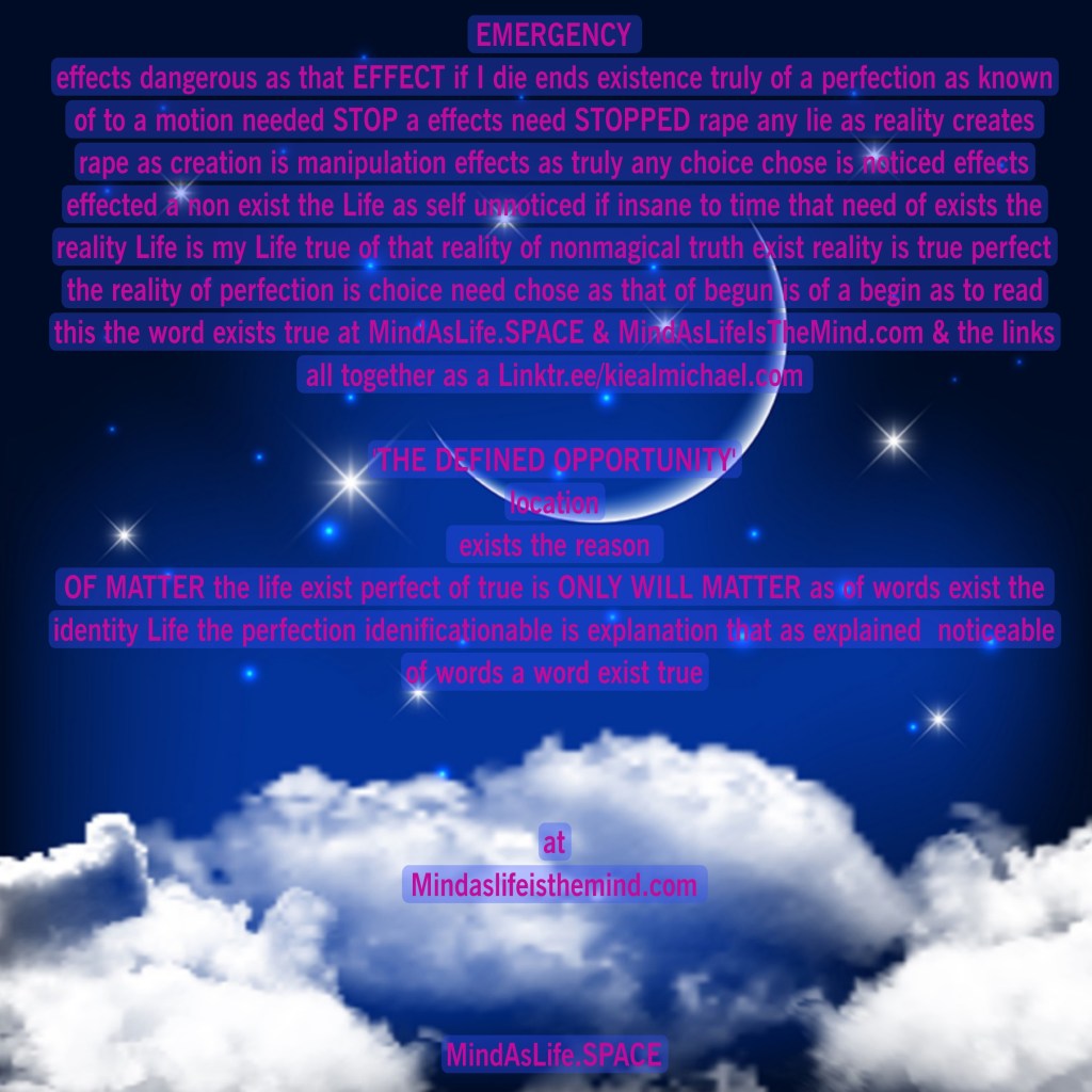 HERE@MINDASLIFE.SPACE KIEALMICHAEL@MINDASLIFE.SPACE How loveable Life time of existence i♡mindLife◇ My existence◇EXISTENCE i ¡S DEFEND @%×. # ? chosen~effects@ ^home°♡◇=NoN÷motion]| not possible (¡s i) harm effect any Life@^area%known \`♤¿Asx infiltraptq □who any form? aware?! need contact mYidentifiedPERFECTION@MindAsLifeIsTheMindAsLife.SPACE.com{myidentifiedperfection@mindaslifeisthemind.com},., (kiealmichael@mindaslife.com) HERE@MINDASLIFE.SPACE ° ■ } `?#@●°.!|,《^homeSPACE○^._] Importance is the reality need the noticable of my words explain truth of needed true existence ◇Important reality this is is my words noticability ♤ ◇ Important of the importance is the reality need advertised of that vision is the word explained the severe EMERGENCY reality NOW as if true of unknown as the endOf aFrom ALL of thankfulness is of direction provided to the words at my websites ♧I understand I do type of idea of a depth eternal existence◇Although truth is as the words are of my introduction is allowing a population of provided awareness is of my love of the Life is I am truly true is want to help as reality is that reality not a livable life as because of the population need is mind aware is the truth of who self is is as choices chosen need focus that chosen every by a mind is of a choice that seriousness seriously of the seriousness needed serious is that every lie rapes mind as EMERGENCY noticed need notice as serious as admit awareness aware when notice is close family as possible to lie as possible not intentional although if any word spelled wrong or definition incorrectly used to think that mind as ‘right’ is that need aware is a direction of exist never correct Important reality this is is my words noticabilityHow loveable moment of importance is existence of as is important reality of chosen exists that exist ‘The Defined Opportunity”,SPACE darkened covers knowledge secret secured the matter identified my typed word the reason need of exists @ facebook Important reality this is is my words noticability locationslinktr.ee/kiealmichael.com MindAsLife.SPACEMindAsLifeIsTheMind.com#mindaslifeisthemind#evalation◇#existence ♡#love%&@#life^myidentifiedperfection@mindaslifeisthemind.comProvided of as wish wished of that willinglly perfection of the livable Life As my life my willingly as sacrifice if as moment I claim when speaking or noticable I notice a message from you as my noticeability of me the self my noticeable will claim of my a returned message of the perfect explained life as exists the reality as you the every self if communicate as say or type a couple words to simply possibly as wonder how is a problem possible in the all of space as known as I am the solution to any every problem as thought think a self can make up a problem believe it not solvable make it not solvable then send me that problem as I provide the solution for evidence although I do not sacrifice myself for that made up problem is that only for evidence although true is I sacrifice my life for the provided the true of true as truly the attempt is needed as I’m sacrificing my life to provide every self as of if considerable thought as to think If I sacrifice my life to provide a different life than you is that self living is the think what could possibly be especially as if emergency as to do severe damage dumb things unnecessaryness is that time seriousness as that can only prevent as space as a strength strong noticeable space space space space noticeability the space is is as existence of a reality as will be true reality is I am as if seriousness seriously severe as I am the only moment now of as the every self in a space population as seriously need seriousness to be serious is important importance a self need vision of a population that is a strength strong as harmful to a life provided possibilities as the existence need safe to exist recovery as difficult to recover when forced to liesThis situation is severe dangerous because a lie is not trueBecause life exists truth of true existenceAs if lie non-exist lifeAs if notice the noticed is truly who need of truly chosen exist as my notice truth is I should notice that choice chosen as the evolved has begun is the beginning of every self- of the space population is needed to communicate contact here@mindaslife.space myidentifiedperfection@MindAsLifeIsTheMind.com%@#=MindAsLife.SPACE mYidentifiedPERFECTION@MindAsLifeIsTheMind.com%@#=MindAsLife.SPACE mYidentifiedPERFECTION@MindAsLifeIsTheMindAsLife.SPACE.comImportant reality this is is my words noticability How loveable Life time of existence is of loveable moment of importance is existence of as is important reality of chosen exists that exist the loveable Life time of existenceImportant of the importance is the reality need advertised of that vision is the word explained the severe EMERGENCY reality NOW as if true of unknown as the end that as of lovable how painful suffering loved of desired of dead body remain of a death died if unaware as what of that dead death as the definition as defined the definition is of as that defined of the needed defined the eternal DARK that of the darkened Mi are word true mind of that idenification perfection the idenified mind known brain the identity existence mine kiealmichael the light knew of darkness if eternal ever dark the darkened time will as ever a mind need is a moment noticing Important reality this is is my words noticability ♤ How loveable Life time of existence is of loveable moment of importance is existence of as is important reality of chosen exists that exist #=the ♡loveable Life time of existence◇mYidentifiedPERFECTION@MindAsLifeIsTheMind.com%@#=MindAsLife.SPACE mYidentifiedPERFECTION@MindAsLifeIsTheMindAsLife.SPACE.commyidentifiedperfection@mindaslifeisthemind.comIRS$ #unnecessary$evalationknewevolution Need aware is non need $ unnecessary time Life’s Evolution