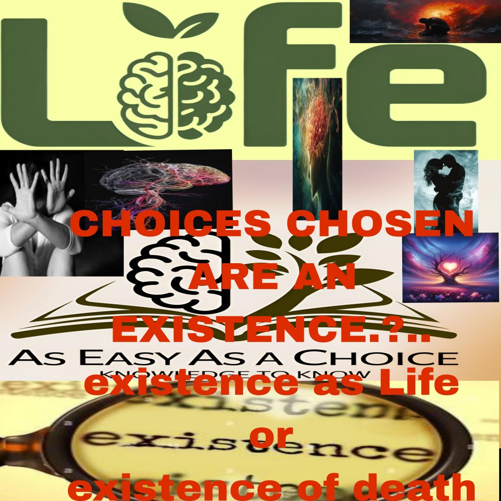 Every choice an individual chooses will be an existence of something, the existence can be Life existence or death existence If death choice is chosen and the individual does not end its life, know that the existence is known as a problem as noticed the choice that effects harms destroys or ends Life as can be noticed if focused attention that certain choices are or can and will cause problems that effect harm and destroy Life